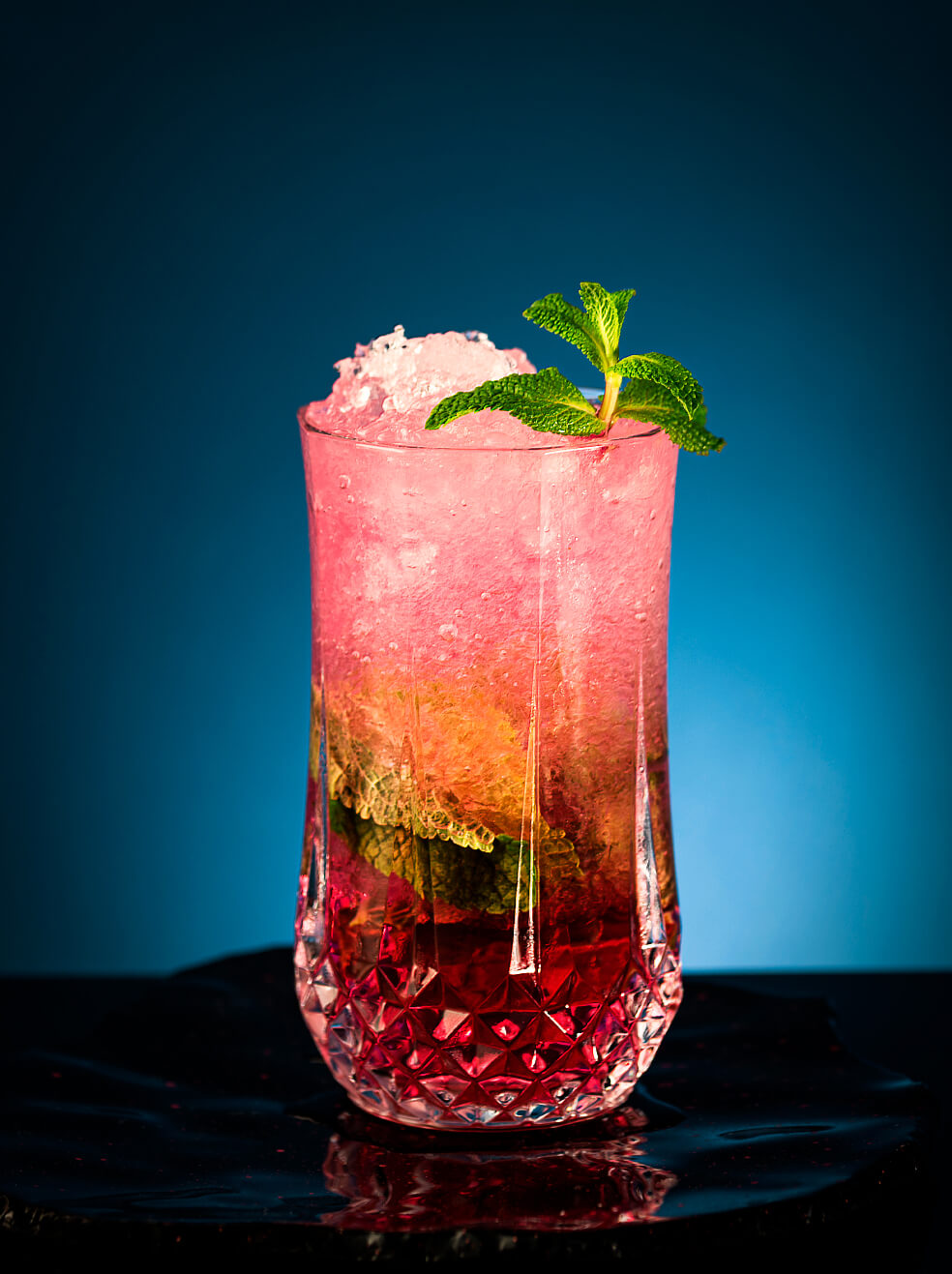 Pour cordial, lime juice and syrup into a glass. "Wake" the mint and put it in the glass. Fill the glass with crushed ice, add sparkling water, stir well, and garnish the drink.